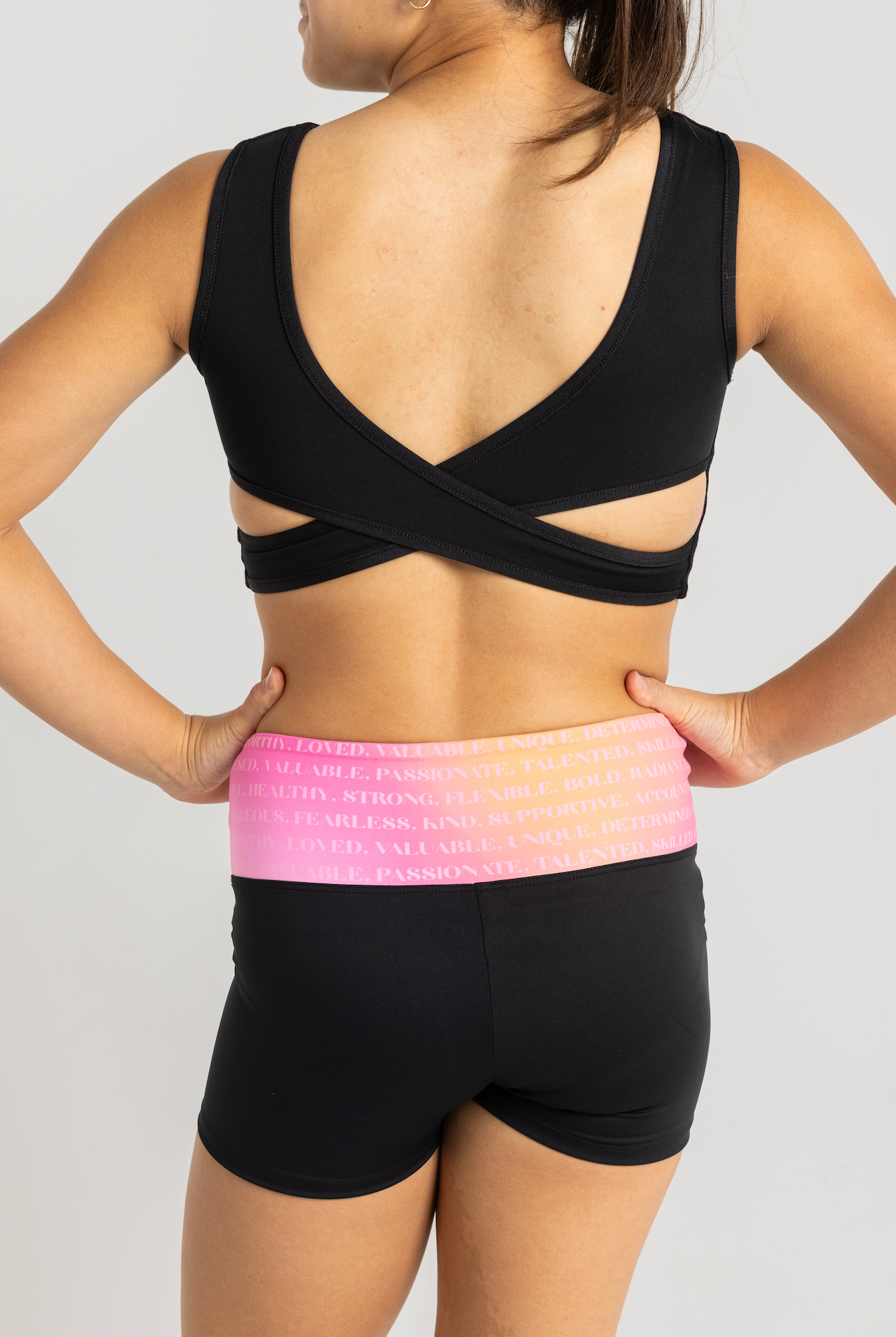The Queen Aura Shorts are a must-have for any gymnast who wants to embrace her best self! They pair seamlessly with the Queen Aura Leotard, featuring positive affirmations on the waistband for encouragement every time you wear them!
