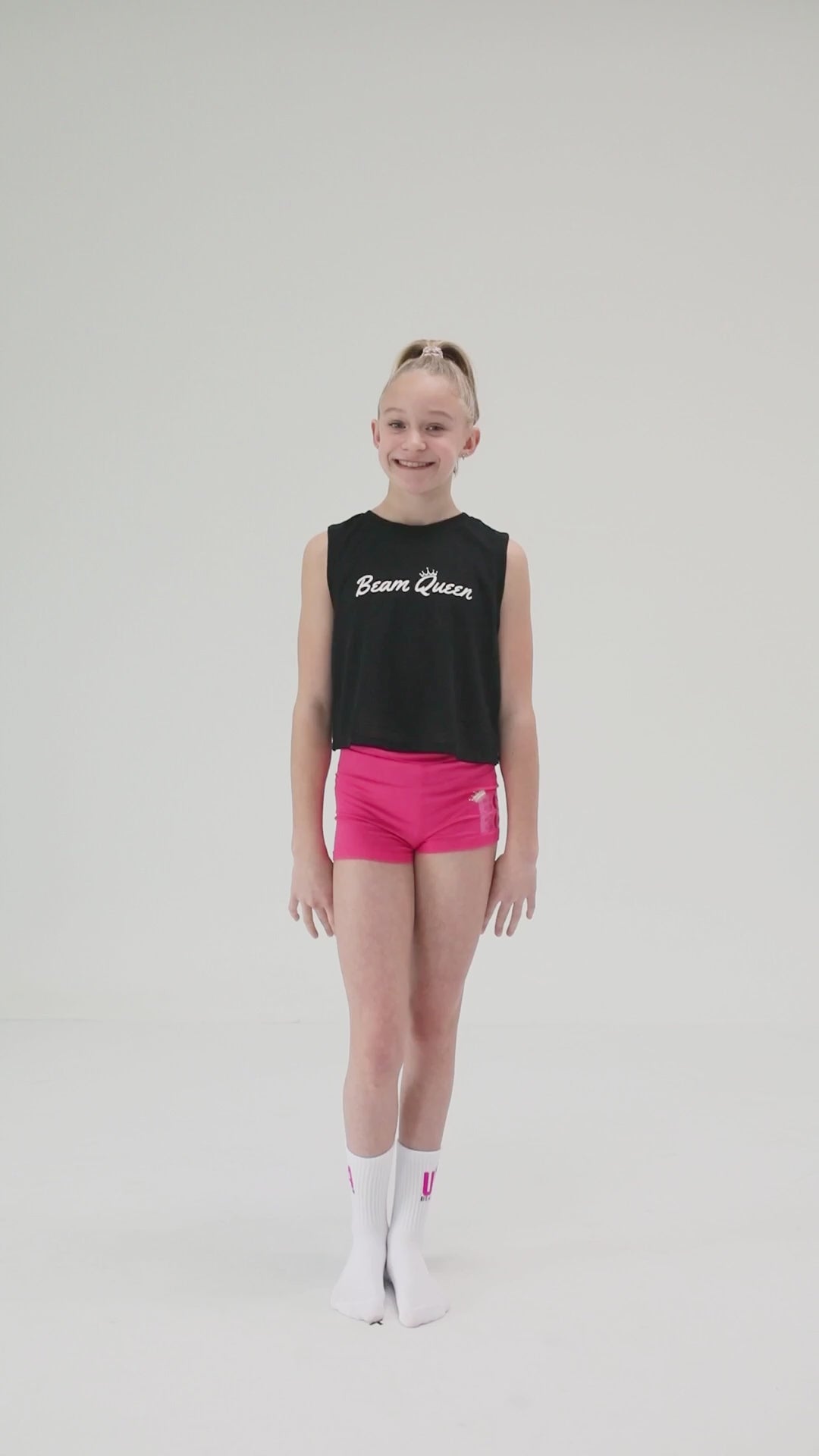 A traditional "Beam Queen" tank but make it cropped! We say "cropped," meaning the end of the shirt should hit right at the gymnasts' waist. It's the perfect tank to wear to wear to the gym, the mall or even school!